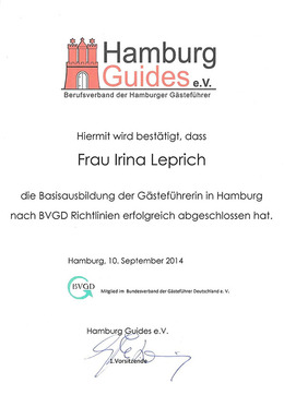 Ich bin zertifizierte Gästeführerin und Mitglied der zwei wichtigsten Hamburger touristischen Vereinen: Hamburg Guides e.V. und Tourismusverband Hamburg e.V